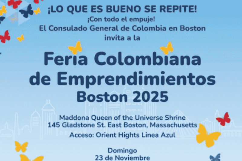 El Consulado General de Colombia en Boston invita a la comunidad colombiana, latinoamericana y al público en general a participar en la Feria Colombiana de Emprendimientos 2025, que se realizará el domingo 23 de noviembre en el Santuario de la Madonna Queen.