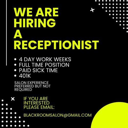 Blackroom Salon está buscando una recepcionista. Si te interesa, puedes enviar tu currículo a [email protected]