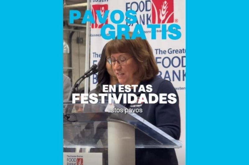 La gobernadora Maura Healey y la alcaldesa Michelle Wu participaron en el 20° Chain of Giving del Greater Boston Food Bank, donde voluntarios pasaron más de 1,200 pavos para donar a familias con inseguridad alimentaria.