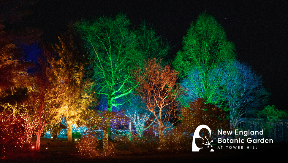 Night Lights: Dazzling Gardens regresa al New England Botanic Garden del 22 de noviembre al 4 de enero. Más de medio millón de luces iluminan senderos, árboles y paisajes que cambian cada año, con entradas desde $25 en temporada baja y $27 en temporada alta. Menores de 3 años entran gratis.