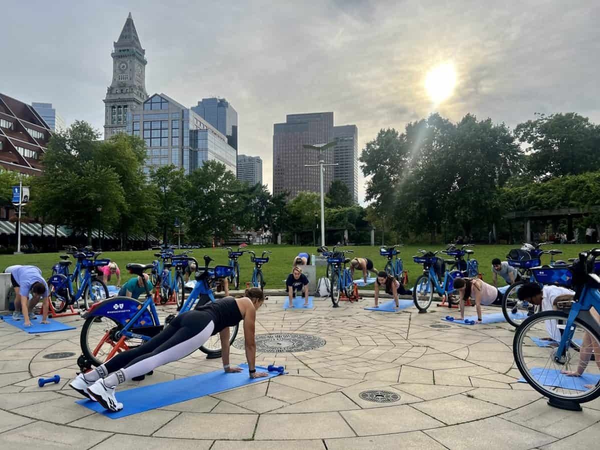 🚲 El lunes 28 de agosto, Blue Cross Blue Shield de Massachusetts (BCBSMA) despidió el Mes Nacional del Bienestar con una clase gratuita de spinning con Bluebikes en el Christopher Columbus Waterfront Park. La clase de spinning de una hora, estuvo dirigida por la instructora de Rev’d, Alyssa Pannozzi. Los asistentes tuvieron una sesión de ejercicio dinámico en Bluebikes estacionarias, complementada con ejercicios de peso corporal fuera de las bicicletas.