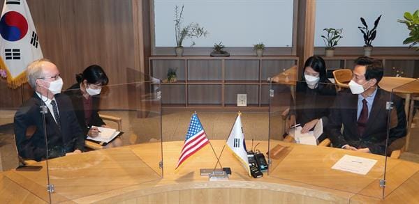 El alcalde de Seúl, Oh Se-hoon, mantiene conversaciones con el embajador interino de Estados Unidos en Corea del Sur, Rob Rapson, durante su reunión en el Ayuntamiento de Seúl. Foto: EFE.