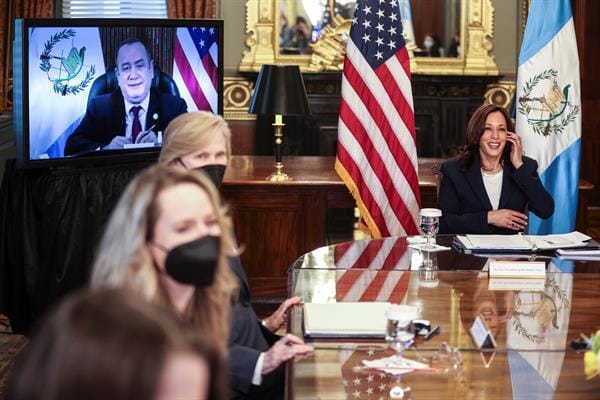 La vicepresidenta Harris se reunió virtualmente con el presidente guatemalteco Alejandro Giammattei para discutir sobre la crisis migratoria entre ambos países. Foto: EFE